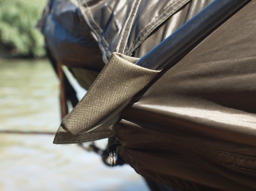 jusqu’à 5,000 mm d’eau. La large porte d’entrée qui s’étend jusqu’au sol du bateau protège aussi efficacement l’intérieur contre le vent. Les poches intérieures en Velcro permettent aussi d’alourdir la porte avec des lests en plomb pour éviter que celle-ci ne batte dans le vent. Une large fenêtre transparente vous permet de voir facilement vos cannes. De plus, la partie avant étanche peut aussi être remplacée par une moustiquaire, un point très appréciable lorsqu’il s’agit de pêcher lors des soirées